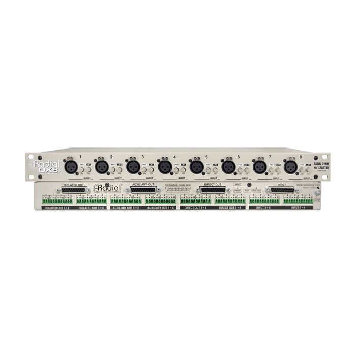 The Radial OX8 is a professional audio tool that is equally at home on a live stage as it is in a broadcast studio, splitting eight microphone signals to multiple destinations simultaneously without noise or distortion, and eliminating hum and buzz from ground loops. Each channel is configured with a balanced input, a direct out which also serves as a return path for 48V phantom power, a thru-put with a ground lift switch, and a fully transformer-isolated output. The OX8 may be ordered with premium Jensen JT-MB-CPC transformers or Eclipse ET-MS10 transformers as an affordable alternative. Each channel also benefits from an ultra-short signal path and built in RF filters to ensure absolute quiet performance even in the most noise-prone environments.