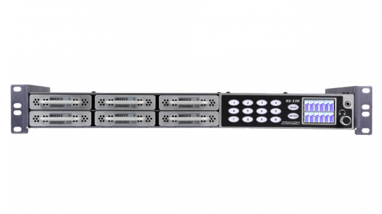 RX-12R is a one stop receiver solution for your rack or cart. It contains a 35MHz tracking front end filter to eliminate interference from unwanted stray RF, an RF amplifier and antenna and power distribution for up to six QRX212 dual receiver modules for the reception of twelve separate TRX transmitters. The built-in frequency scanner and Auto-Pick software can coordinate and choose the best frequencies. Pair the RX-12 with Nomad 10 or Nomad 12 and ZaxNet will re-frequency your transmitters to match with the touch of a button. In addition, the RX-12 and Nomad combo allows for quick and easy TRX gain adjustments.