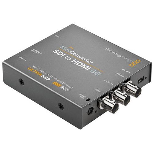 The Blackmagic Design SDI to HDMI 6G Mini Converter converts SDI in resolutions up to DCI 4K (4096 x 2160) at 24p and UHD 4K (3840 x 2160) up to 60p to HDMI. This is useful for connecting consumer devices that require HDMI signals with professional SDI video equipment. With a compact form factor and easy-to-use controls, the Mini Converter is ideal for a variety of broadcast, post production, and professional AV applications.