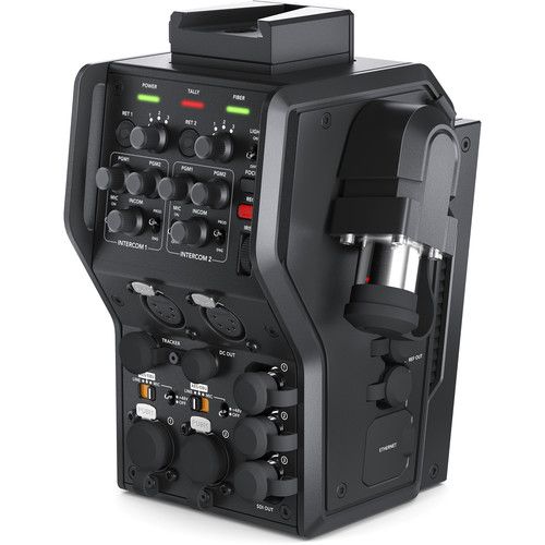 Secure the Blackmagic Design Camera Fiber Converter to your URSA Broadcast camera to interface with studio infrastructure via SMPTE fiber optic cable and a separately available Studio Fiber Converter for breakout up to 1.6 miles away. The converter moves the most common camera controls to the rear of the camera assembly for ease of operator access. Studio-standard connectivity includes talkback headset 5-pin XLR ports, as well as SDI video for monitor output. In total, the Camera Fiber Converter has a single outgoing 12G-SDI connection for HD or UHD 4K video and three incoming 3G-SDI connections for monitoring with a separate studio viewfinder. Use the V-lock at the top to secure the studio viewfinder. All mounting hardware is included for securing the converter to the camera.