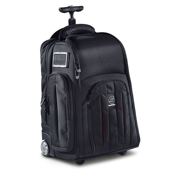 The Sachtler Camera Rollpak combines the portability of a backpack with the convenience of built-in wheels and trolley handle. It is designed to fit a mid-sized camcorder up to about 18" long, with microphone, viewfinder, and accessories attached. It features a wide U-shaped opening for rapid access to your rig, removable rigid internal dividers for custom configurations, and internal LED lighting to help you view your contents even in dimly light environments. Floor, viewfinder, and microphone compartments are reinforced with cold-molded laminate panels to provide additional protection for your gear. The pack can be worn on your back using padded shoulder straps, held using a carry handle, or rolled using the built-in wheels and retractable trolley handle.