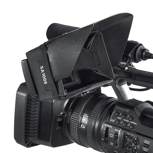 The Sachtler SA1009 Mini Hood is a lightweight solution for shading your 3.5" LCD viewfinder. It fits securely over the LCD, and features a two-piece design. The rigid internal panels help hold its shape, while the padding provides protection should you bump into it. The black binding strap holds the hood securely, and its design allows it to fold flat for storage when not in use.