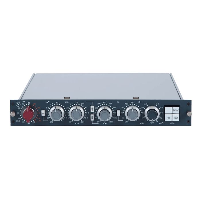 The AMS Neve 1081 is a member of the original 10-series preamp/equalizers whose siblings include the venerable 1073, 1084, and 1066. All of the preamps in the series share precisely the same input and output sections, with the only difference being the equalizer sections in order to offer more tonal options. The difference between the 1081 and the 1073, is the addition of high- and low-pass filters with five center frequency options. While the high-frequency band of the 1073 is a shelving EQ with a center frequency of 12kHz (one of the reasons it’s so popular), the 1081 offers five center frequencies with selectable shelving or peak curve. A truly classic component in a recording front-end or mixing environment, often seen in the credits on today’s platinum-selling albums, the 1081 provides remarkable sensitivity, fast and musical response to transients, plus inimitable Neve equalization.