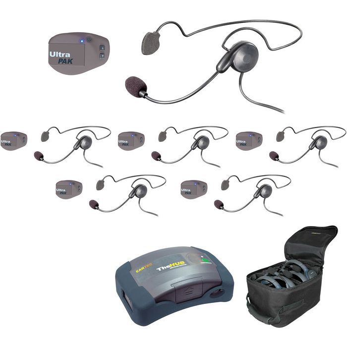 The Hub is designed to extend the range of your existing Eartec wireless system by over 1000', and moreover, you can wear it on a belt, and thus allow your hotspot to travel with you or you can place it in a single, changeable location. The UltraPAK utilizes Digital Enhanced Cordless Technology (DECT) to provide simultaneous wireless communication within a quarter-mile range. It weighs only 2.5 oz and includes a volume control, mute button, and LED indicator. The Cyber Headset features a thin, malleable back band, which runs around the neck, and a miniature speaker that sits in the ear.