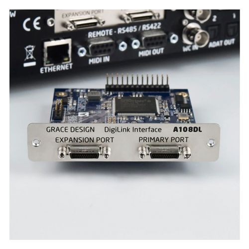 The optional A108DL Digilink module allows the m108 to connect to Avid Pro Tools|HD Accel, Pro Tools| HDX, and Pro Tools|HD Native interfaces. The A108DL module emulates the Avid HD I/O interface and features two Mini-Digilink connectors. One is labeled "PRIMARY PORT" and one is labeled "EXPANSION" port. The concept of these ports is similar to those on an Avid HD interface. However, since the m108 is an 8 channel input and 2 channel output device, these ports allow two m108s to be connected together to emulate one Avid HD I/O with a standard configuration of 1 ADC card, 1 DAC card, and one Digital IO card.
