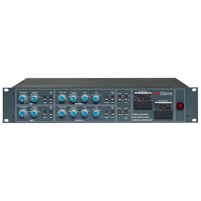 The Neve 33609 N is a two-channel compressor, with the same hand wired transformers, and feedback circuit as the classic Neve 2254. The 33609 N is the ideal compressor for the stereo bus on audio mixing and mastering, as well as broadcasting applications. It offers a very transparent compression with its 1.5:1 ratio setting, or can be slammed up to 6:1 to get as much attitude as you desire, commonly used on drums, vocals, pianos, and other acoustic instruments. Overall compression is displayed by the front panel, moving coil meters.