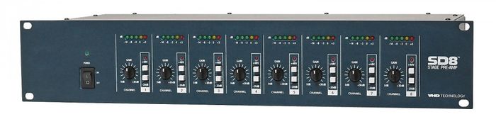 The VHD SD8 is an eight-channel stage preamp designed with individual line drivers that maintain audio signal integrity over long cable lengths. As cable lengths increase, the length of the cable creates a high capacitance load that most microphones have difficulty in driving. The SD8 features eight independent mic inputs with gain control adjustment, -20 dB pad and 48V phantom power. Each input has two outputs allowing signal routing to two separate locations such as front of house and monitoring consoles. A five bar LED display provides signal level information and a rotary knob provides 0db to +30 dB of gain control.