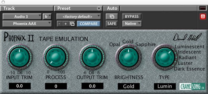 Phoenix II has five different tape-analog characteristics, The type is selected with a switch for easy comparison between the types, and the brightness is also selected with a switch. Gold is the position where the color is approximately flat in frequency response, with Sapphire being a brighter, and Opal being a warmer tonality. A level control determines the amount of the Phoenix II process integrated into the audio signal, and an input trim determines "how hard you hit the tape." Because the DSP process is level dependent, the input level trim control has been improved and an output trim control has been added.
