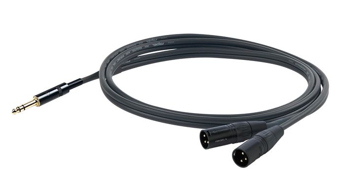 New professional assembled “Y” cable with YONGSHENG Ø 6.3 mm Stereo jack plug - 2 x YONGSHENG 3P XLR male plug, black housing and gold plated connections. Length: 1.5 m. Available colour: Black