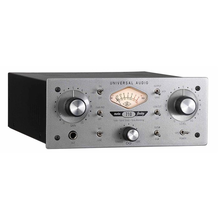 The 710 Twin-Finity from Universal Audio is a single channel, dual path microphone preamplifier that includes an instrument direct inject (DI) input. The dual path design combines the "warmth" of a high-voltage vacuum tube design with the clarity of a solid-state circuit. A blend control allows the dialing-in of either circuit or a combination of both in varying degrees.