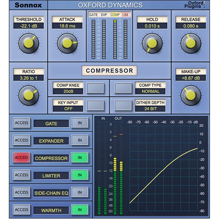 The Oxford Dynamics from Sonnox is a plug-in modeled on the dynamics section used in the Sony Oxford OXF-R3 professional mixing console. It offers separate compress, limit, expand, gate and side chain EQ functions, with full control of all parameters. Features such as selectable time constant curves and variable soft compress functions allow the user to obtain anything from unobtrusive level control and mastering functions, to the production of heavily processed artistic effects.