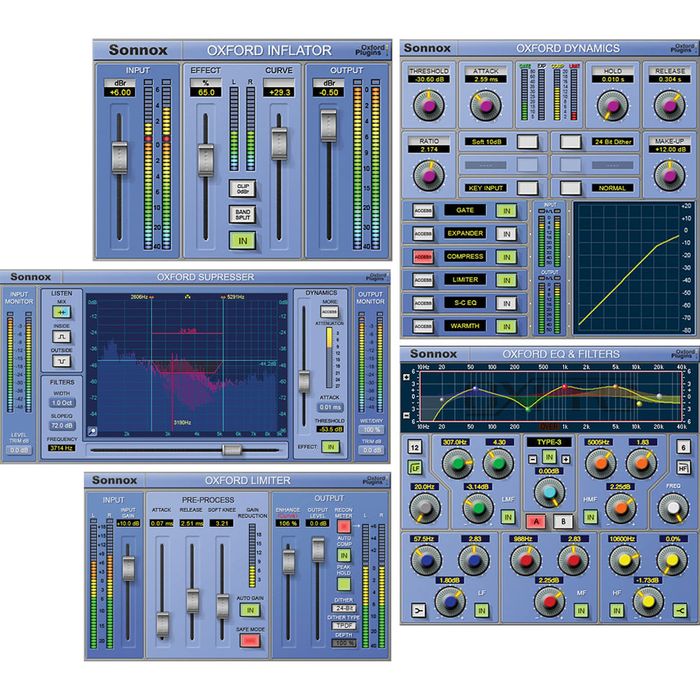 Plug-ins include the Oxford EQ and Dynamics, the Inflator for maximizing loudness, the preset-packed Oxford Limiter, and the SuprEsser for fixing problematic frequencies.