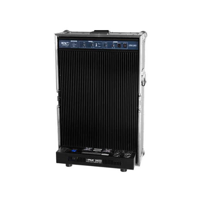 K-PAK2600 is a three-way, active control and amplification unit specifically designed for the K-RIG Groundstack loudspeaker system. It houses all signal processing and three individual amplifiers in a road-rugged enclosure with built in cable storage compartment with suspension system and passive heat sink along with two demand-sensitive fans for added reliability.