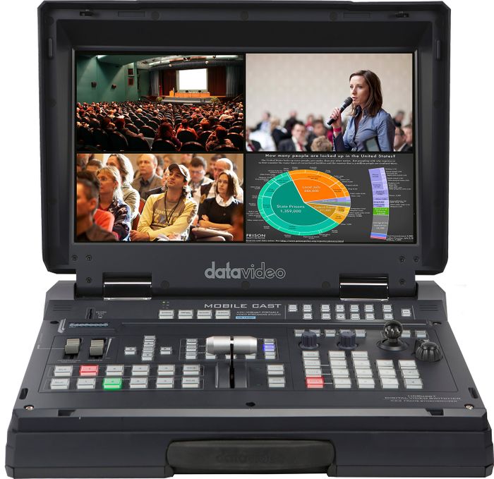 Bring your broadcast mobile with this HS-1600T Mark II 4-Channel HD/SD/HDBaseT Portable Video Streaming Studio from Datavideo. This mobile studio utilizes HDBaseT technology to control up to three Datavideo PTZ cameras while streaming H.264 video to the web. It features three HDBaseT inputs that can control connected cameras and accept video inputs, as well as one HDMI input to add an additional video source. Three HDMI program outputs allow you to connect to monitors to display your program, one HDMI is for graphics output, and a streaming RJ45 LAN output connector lets you stream live to the Internet using a minimum Cat 6 cable. Depending on the data rate of your stream, you can also record to an optional SD card.