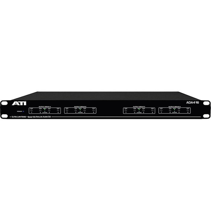 The ATI ADA416-PHX is an amplifier capable of routing audio to four distribution amplifier channels, all via balanced Phoenix inputs and outputs. The unit provides a master gain adjustment control for each channel, while individual trimmers are on hand for each output to accommodate gears of various sensitivities over its 20 dB range. Use it to distribute audio in offices, nightclubs, and more.