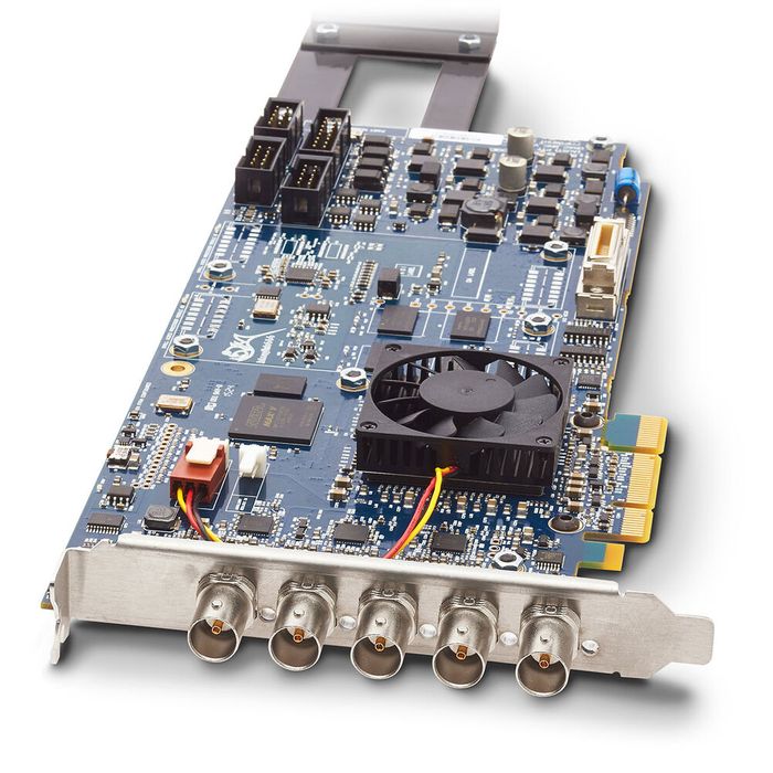 The BlueFish444 Epoch | 4K Supernova is a full-length PCIe I/O card with four bi-directional BNC connectors that accept 3G/HD/SD-SDI and ASI signals. A fifth BNC supports multi-format input of bi/tri-level analog genlock, SDI, ASI, AES/EBU, and LTC, while an additional BNC provides a copy of the SDI output from BNC 2. The card supports up to DCI 4K (4096 x 2160) 4:2:2 10-bit and accepts single link, dual link, and quad link formats. It features 12-bit internal processing, 4 x 1D x 12-bit LUTs on all SDI outputs, two RS-422 serial ports, and has 256MB of on-board memory. This model features connectivity for AES/EBU digital audio, analog audio, RS-422 control, and LTC input/output, which are all available via an included breakout cable.