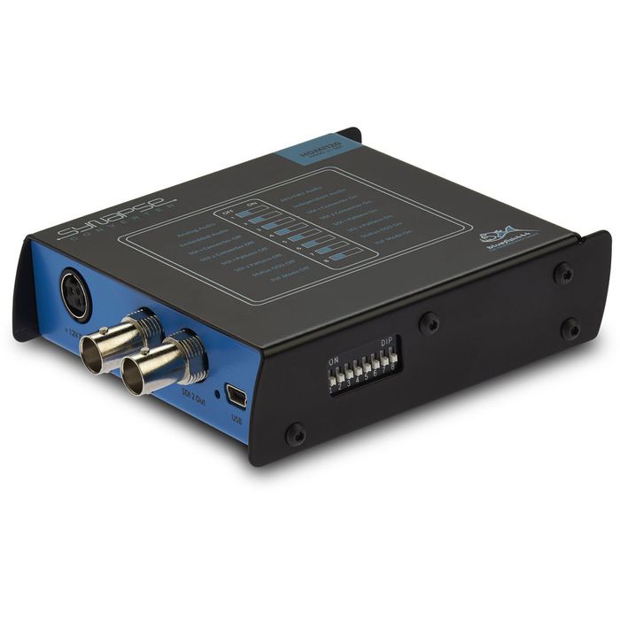 The Synapse HDMI120 HDMI to SDI Converter from BlueFish444 is designed to perform a number of conversions, including HDMI to HD/SD-SDI, video downscaling and progressive to PsF processing. All settings are configured via DIP switches on the side of the unit. The HDMI120 also offers a redundant HDMI input and HD/SD-SDI output, which ensures against a workflow failure in the event of a lost signal. Synapse converters support up to eight channels of embedded audio, and HDMI120 also features independent AES and Analog inputs, which can be muxed together with the video signal and output as embedded audio.