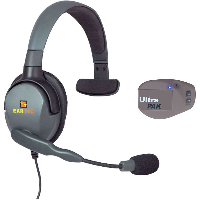 The UltraPAK is a beltpack radio weighing only 2.5 oz and features and ergonomic design for comfortable fit. It includes a volume control adjustment, a microphone mute button, and LED indicator, and works up to six hours on a single charge. The Max4G Single Headset features fully adjustable headband and foam padding with a 270° rotating boom arm.