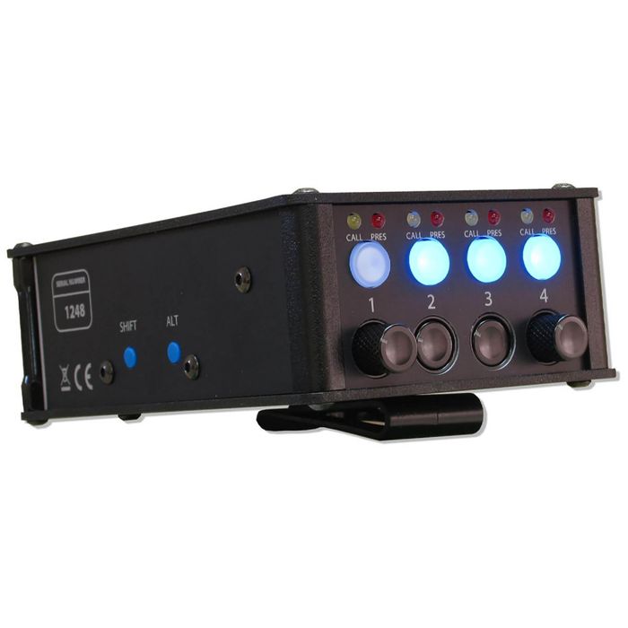 Four separate talk buttons route the microphone input to either of the 4 network outputs. The button operation can be configured as momentary, latching or intelligent. A double tap on any of the talk buttons will produce a 'call' signal alert that will be received by another Beatrice unit. An LED indicates an incoming call alert, which will also produce an audio indication on the headphones.
