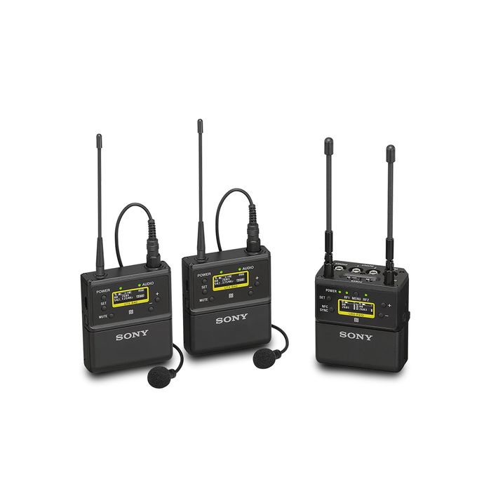Wireless bodypack microphone package with bodypack transmitter, 2-channel portable receiver, lavalier microphone and accessories: easy to use with high quality sound and seamless integration with Sony cameras.