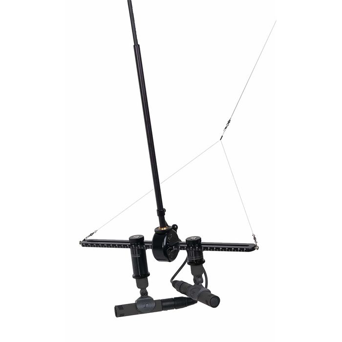The Spacebar Hanging Adapter assembly consists of an aluminum wire tube that threads into the stand mount threads of the SB-30 or SB-66. A stereo (4 conductor) microphone cable is used to hang the assembly. The microphone cable is secured in the wire tube with a thumb screw that binds into the cable insulation. The microphone cable (supplied by the user) is threaded through the wire tube and then terminated to two female XLR microphone connectors. While this is a permanent arrangement that must be assembled it is very secure and ensures that there is no way that the Spacebar assembly can become detached from the cable and fall.