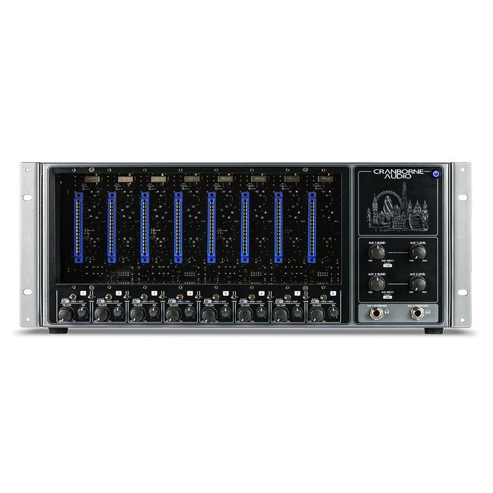 High-current 8-slot 500 series rack with built-in A/D & D/A conversion, low-jitter internal Master Clock, ADAT interfacing, zero-latency headphone monitoring, and 8-to-2 analogue summing mixer.