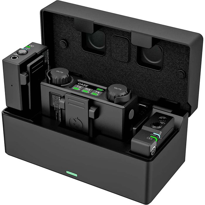 Both the transmitters and the receiver feature built-in rechargeable batteries. The transmitters will each run up to 4 hours, while the receiver offers up to 7.5 hours of operating time; this means that for single-person shoots, the second transmitter can be used to extend your shooting time if necessary. The included storage and transport case automatically pairs the components and recharges them in 2.5 hours using its USB input port.