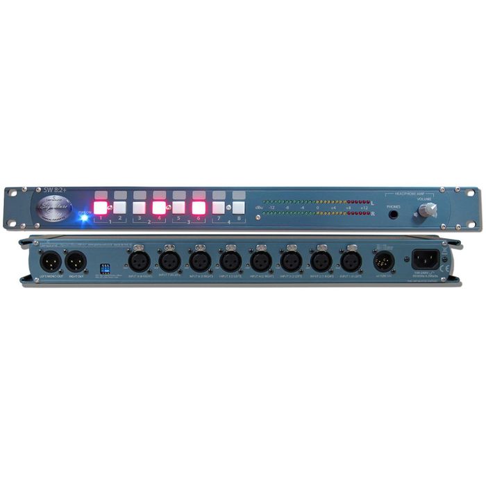 On the front panel there are 8 large illuminated buttons for turning sources on/ off. They work as 8 individual switches when in the mono mode and 4 pairs of stereo switches when the SW 8:2+ is set to stereo.