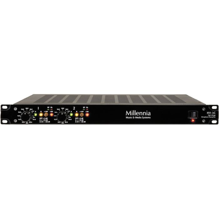 The Millennia HV-3C is an updated design of the HV-3B two channel mic preamp, with improved mechanical design and cosmetics, and standard 36 step gain control. Combining a precisely matched octet of discrete bipolar transistors with a laser trimmed DC coupled FET-based output driver stage, the HV-3C is an entirely "double balanced," extremely wide dynamic range stereo microphone preamplifier intended for demanding acoustic recording. According to Gary Garritan of Garritan Orchestral Strings, "Millennia Media HV-3 is the preamp of choice. I own a number of high-end mic preamps and always reach for the HV-3 when recording orchestral samples."