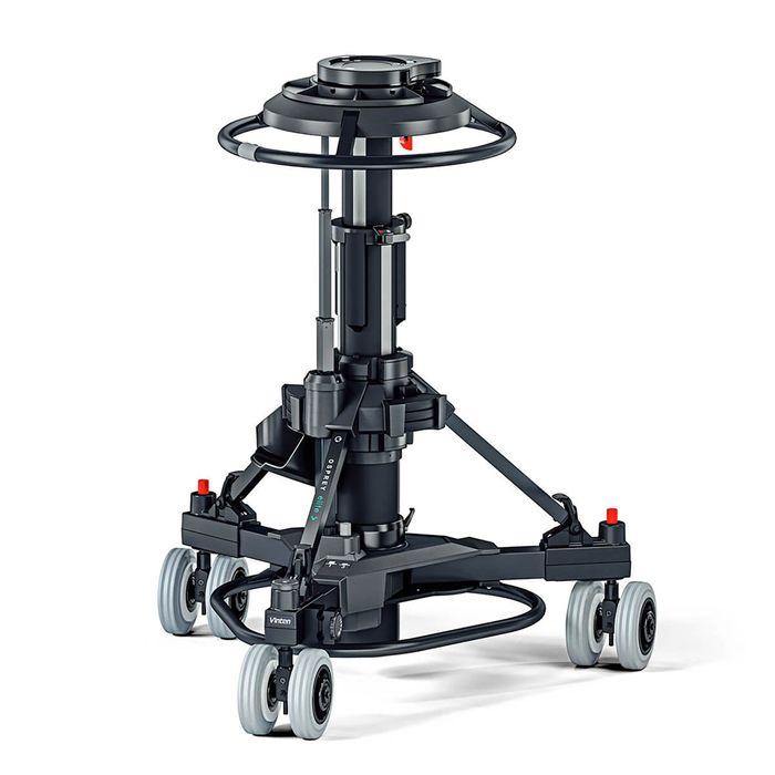 Fully steerable pedestal with perfect balance of its entire extended stroke. Perfect for complete 'on shot' tracking in field applications. Payload up to 80kg / 176lb. The Osprey Elite S (OB) is a Portable, fully functioning studio pedestal for large payloads up to 80kg / 177lb. It the most versitile pedestal, capable of supporting large Vinten Vector Heads and the lastest range of portable or full facility digital cameras and teleprompters. It can track talent eyelines from a seated to standing position 'on shot' with its extended fully balanced range. It has an inlet valve for any air source, making Perfect Balance easy to achieve. There is a storage area for the camera operator. In addition, the Osprey Elite S pedestal includes a pressure gauge for clear and reliable set-up and the detachable skid allows the pedestal to be simply broken down into two sections for easy storage and transportation. It has a selector for both single wheel and all wheel crab steering for working in tight spaces and on shot direction changes. It comes with 16cm / 6.3 inch wheels for greater ground clearance in outside broadcast applications.