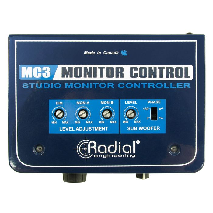 The MC3 handles all of your studio monitor switching needs in a small footprint that easily fits on any desktop. Connect two sets of powered speaker and a subwoofer and easily select any combination, with a large master volume control for setting levels. A Dim switch lets you temporarily lower the speaker level without altering your main volume setting, and a Mono switch provides an easy way to check for phase compatibility. The MC3 features a passive audio circuit for clean and transparent audio, along with an active headphone amp to drive multiple sets of headphones and monitor silently when necessary.