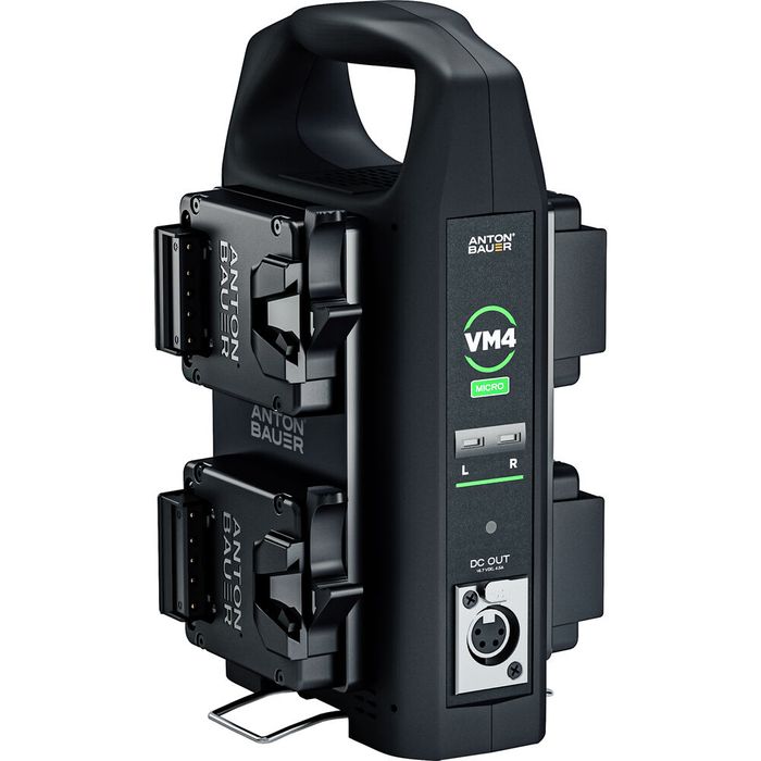 With four V-Mount micro battery mounts and an XLR4 DC output the Anton/Bauer VM4 charger is the ideal solution for roaming imagemakers. Simply connect to AC power and pop the integrated support stand to create a quick-to-set-up plug and play charging station for Gold-Mount batteries, and a 16.7VDC 4.5Aconvertor for XLR power input devices. The slim profile is designed to stack and pack, perfect for transportation when space matters.