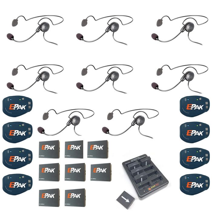 - 1- E-PAK MAIN Transmitter 7- E-PAK REMOTE Transmitter 8- Cyber wired plug-in headsets 1- 10-Port Charger w/ Adpater 8X Lithium-Polymer Batteries 1- Small Soft Padded Case