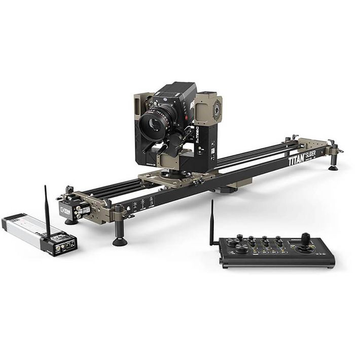 TITAN MOCO 1000 - BULLHEAD STUDIO Kit - x1 TITAN 1000 Slider, x1 TITAN Dolly (pre-attached) with damping and brake knobs, x4 Detachable feet with height adjustment, x1 75/100mm bowl adapter with height adjustment pins, x1 Flat mounting plate with 3/8" thread, x2 Short Locking Handle (M10 & 3/8"), x1 V-Mount Adapter and plate set, x1 TITAN Stepper Drive, x1 2m Timing belt, x1 3m LEMO Power Cable for TITAN stepper drive, x1 BULLHEAD STUDIO, x1 2m LEMO Cable (L1M6F), x1 BULLHEAD STUDIO Transport Hard Case, x1 KAIROS Controller, x1 3m mini-LEMO Control Cable (L0M4), x2 3m RJ-45 network cables, x1 USB-C Cable, x2 Wi-Fi antenna, x1 KAIROS Controller Transport Hard Case, x1 PSU 320E Power Supply (320w) with integrated SLIDELINK v3.0 network adapter, x1 110v/230v Power Cable. Items such as Cable Guides, Cables, Tripods, Transport Case, Quick Mount and Drives are also available.