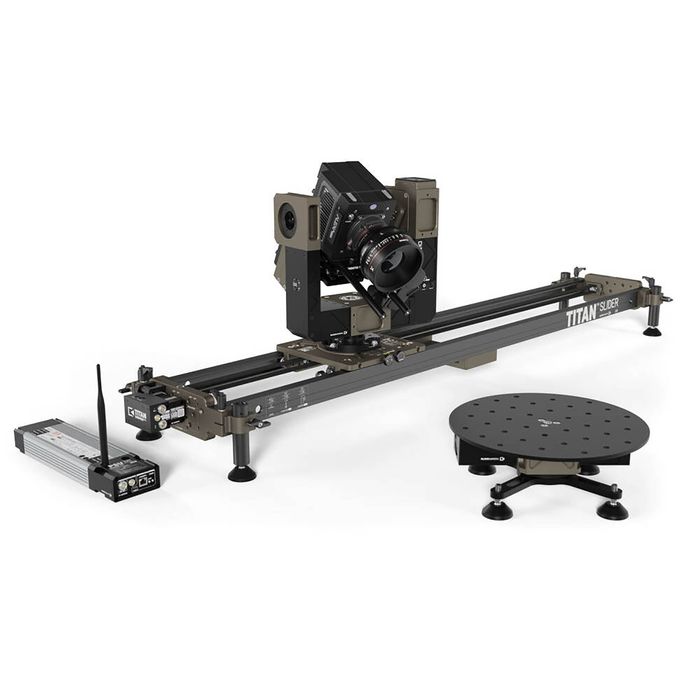 ANIMATOR'S SET (1500) - Includes: x1 TITAN 1500 Slider, x1 TITAN Dolly (pre-attached) with damping and brake knobs, x4 Detachable feet with height adjustment, x1 75/100mm bowl adapter with height adjustment pins, x1 Flat mounting plate with 3/8" thread, x2 Short Locking Handle (M10 & 3/8"), x1 V-Mount Adapter and plate set, x1 TITAN Stepper Drive, x1 3m Timing belt, x1 3m LEMO Power Cable for TITAN stepper drive, x1 BULLHEAD STUDIO, x1 1.5m LEMO Cable for BULLHEAD STUDIO, x1 BULLHEAD STUDIO Transport Hard Case, x1 PSU320E Power Supply (320w) with integrated SLIDELINK v3.0 network adapter, x1 Dragonframe license for SLIDELINK v3.0, x1 110v/230v Power Cable, x1 3m RJ-45 network cable, x1 Wi-Fi antenna. Items such as Cable Guides, Cables, Tripods, Transport Case, Quick Mount and Drives are also available
