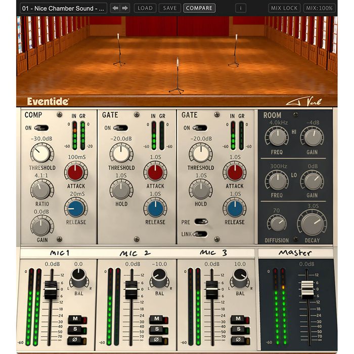 A faithful recreation of Tony Visconti's three microphone technique used with David Bowie on "Heroes" at Hansa Studios, Berlin. Eventide takes this concept to the next level. With the Tverb reverb plugin you can run your tracks through this legendary room with one close mic and two movable stereo room mics with control over the response characteristics of the room.