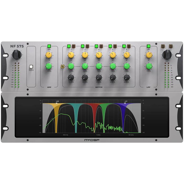 The McDSP NF575 Noise Filter is a high-resolution filter set designed to remove a wide variety of noise types from audio. Accurate high pass and low pass filters reduce low frequency rumble and high frequency hiss. Selectable slopes of 6, 12, 18, 24, 30 and 36 dB/Oct and frequency control range covering the entire audible spectrum make the NF575 filters extremely flexible.