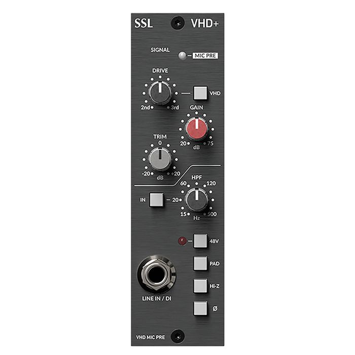 The VHD+ Pre Module for the popular 500 format modular rack platform makes the uniquely versatile VHD based preamp technology from Duality, SSL's industry leading large format studio console, available for studios of all sizes. The VHD+ Pre module is an immensely versatile recording and processing device. It can deliver ultra clean SSL SuperAnalogueTM grade recordings but also features a switchable VHD mode. SSL's patented Variable Harmonic Drive (VHD) system uses a 100% analogue signal path to generate rich harmonic distortion.