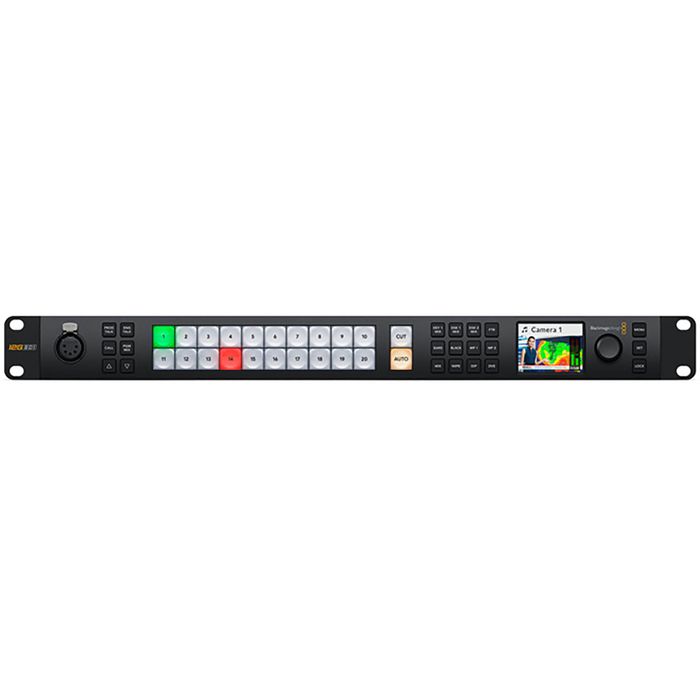 The switcher features a reference video input, and each input features a frame synchronizer, frame rate converter, and format converter. This allows you to mix and match cameras, formats, cameras that do not feature genlock, and video input from computer sources. Upstream and downstream keyers and effects are supported. All this is done live and in real time with no rendering required. You can control the switcher using the integrated front panel, optional Blackmagic ATEM panels, or via the downloadable control software.