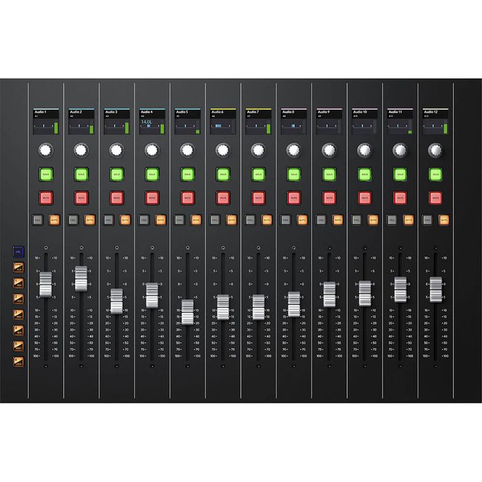 Each of the 12 channels features a touch-sensitive 100mm belt-driven motorized fader, a customizable soft knob for panning, and buttons for solo, mute, call, and automation. Use the solo and mute buttons to quickly isolate tracks or temporarily turn them off. Call buttons can be used to load track parameters, set up fader banks, and spill bus tracks to adjoining faders. Auto buttons enable automation.