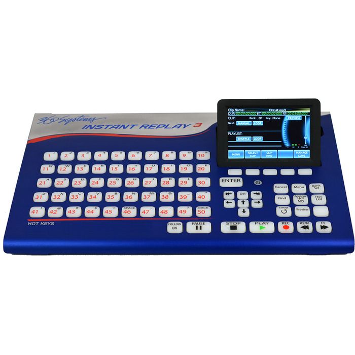 The large, full color, touchscreen provides detailed information on the status of the clips loaded, playing and cued. Accessing content to load onto the Hot-Keys or viewing bank information is even easier. The built-in editor allows for simple head and tail trims, and the adjusting of fade-ins and fade-outs of any clip. These settings are now stored in the metadata of the clip so transferring from one Instant Replay to another will retain these settings for use. Backup or restore the Hot-Key database, settings database and or the system content to easily retain copies or reset systems without having to reprogram.