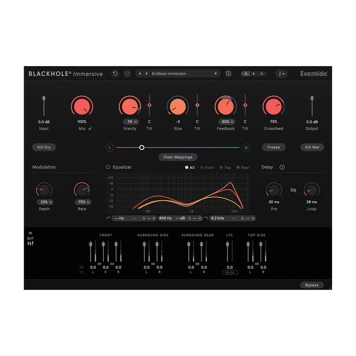 Designed from the ground up for immersive, Dolby Atmos, and surround workflows, Blackhole® Immersive expands the signature sound of Eventide’s stereo version across your entire immersive mix. Used as a send or insert, Blackhole Immersive remains respectful yet reactive to your carefully chosen track positioning.