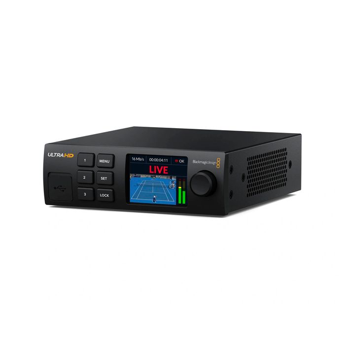 Both the front and rear panels of the decoder include USB-C connectivity for tethering high-speed 5G and 4G phones. In the event of an internet failure, the device automatically switches to the connected phone's data connection, although users can prioritize either the Ethernet or phone connection, as per their specific applications. For cameras without built-in streaming, the Blackmagic Streaming Encoder can be used, with control embedded in the encoder's SDI monitoring output, connecting to the SDI input of the Blackmagic camera. The ultraportable device is only 5.5" wide, allowing users to align it with up to two other optional devices on a rackmount unit, using only 1 RU of space. The decoder comes with the Blackmagic Streaming Utility software.
