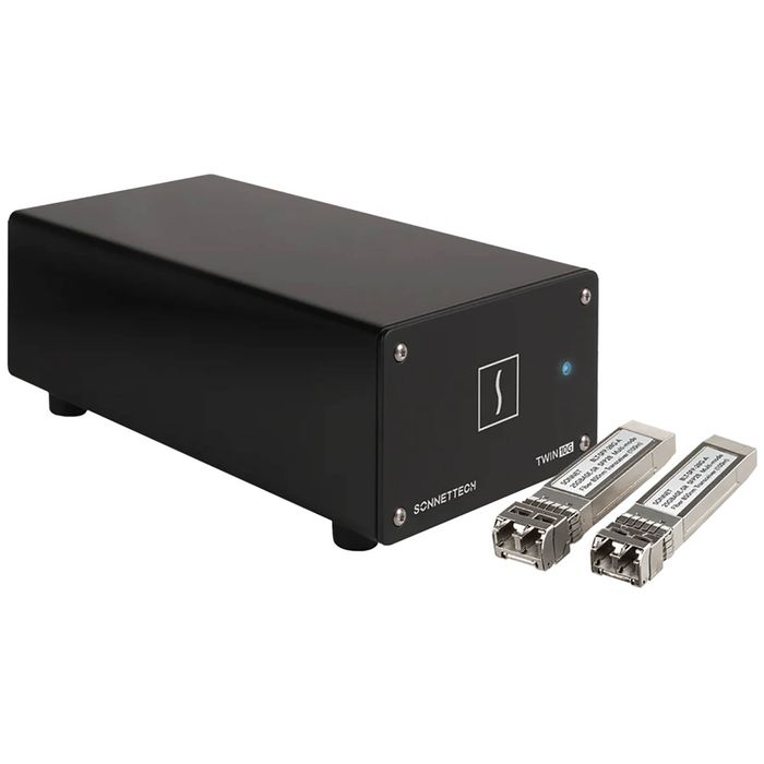 Twin10G SFP28 Thunderbolt Adapter is a pre-configured bundle of Sonnet Twin10G SFP28 PCIe Card with Sonnet Echo Express SEL Thunderbolt Expansion System.