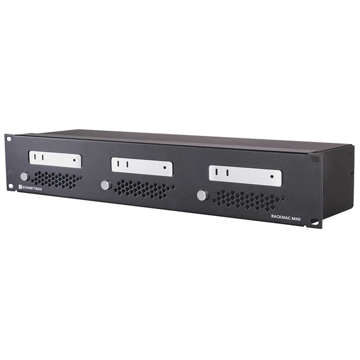 RackMac mini (2024+) is a rugged steel 2U rackmount enclosure for securing three Mac mini computers side-by-side in a rack, placing them behind an efficient and protective front panel. Convenient front panel operation allows you to turn Mac minis on and off with their own dedicated front power buttons. Front and rear panel openings provide access to all the computers’ ports, enabling you to connect and disconnect cables easily without needing to remove the computers from the enclosure.