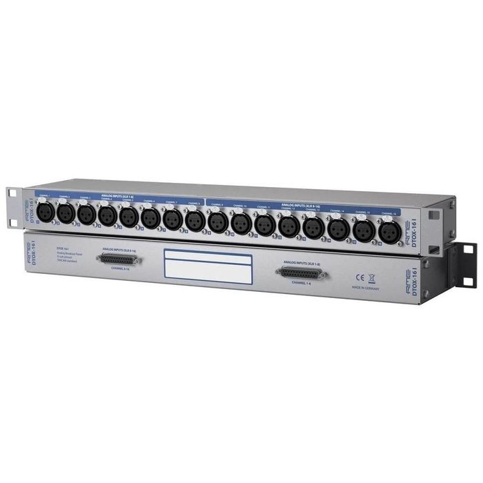 DTOX-16 I connects 16 XLR inputs to two D-sub 25-pin connectors (channels 1-8 and channels 9-16). The breakout panel supports all interfaces using analog 25-pin D-sub inputs as well as the following RME interfaces: M-32 AD, M-16 AD, M-32 Pro AD, M-32 Pro DA.